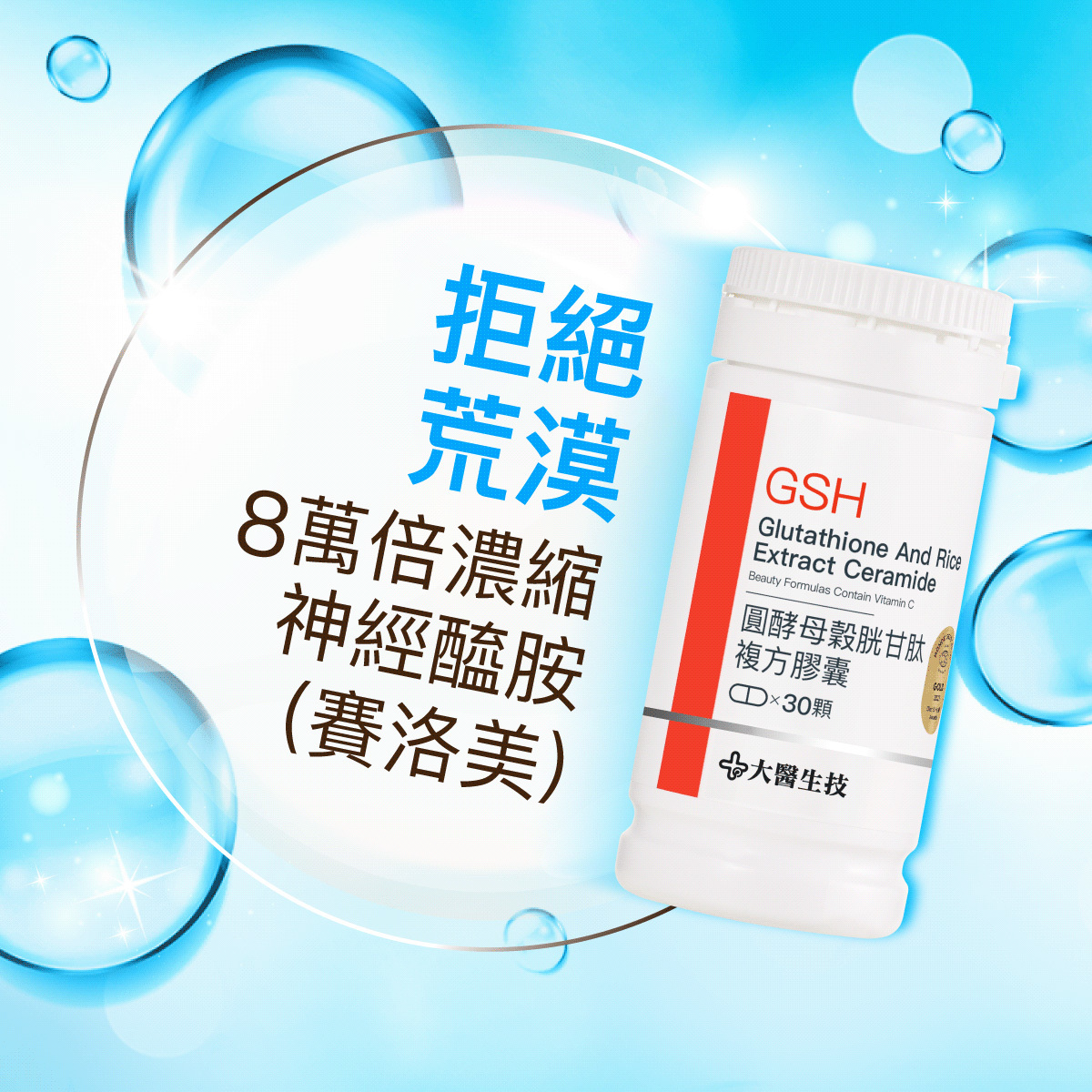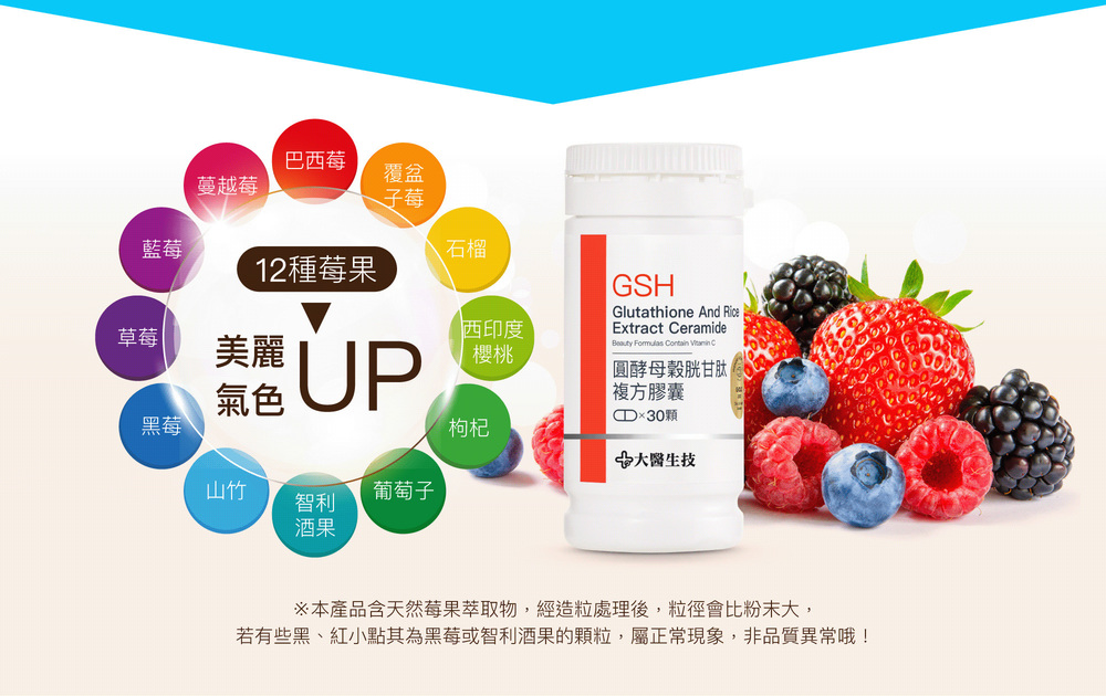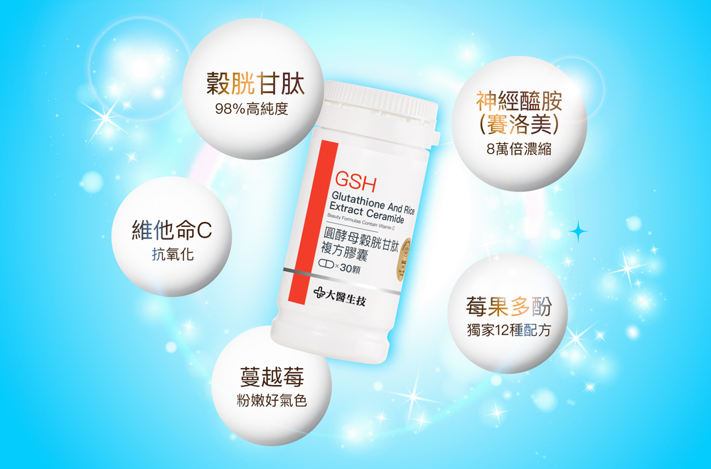 大醫生技圓酵母穀胱甘肽複方膠囊含圓酵母萃取 98% 高純度穀胱甘肽(GSH),可補充體內GSH、從根本散發自然光;非基改玄米萃取的神經醯胺(賽洛美),讓身體保持滿滿地水潤感!此外,特別添加 12 種莓果萃取物,含天然的植物營養素,如類黃酮、維生素、礦物質等,以及最重要的花青素等天然多酚物質;維他命 C 可促進膠原蛋白的形成,具抗氧化作用,讓你由內而外散發迷人光彩!