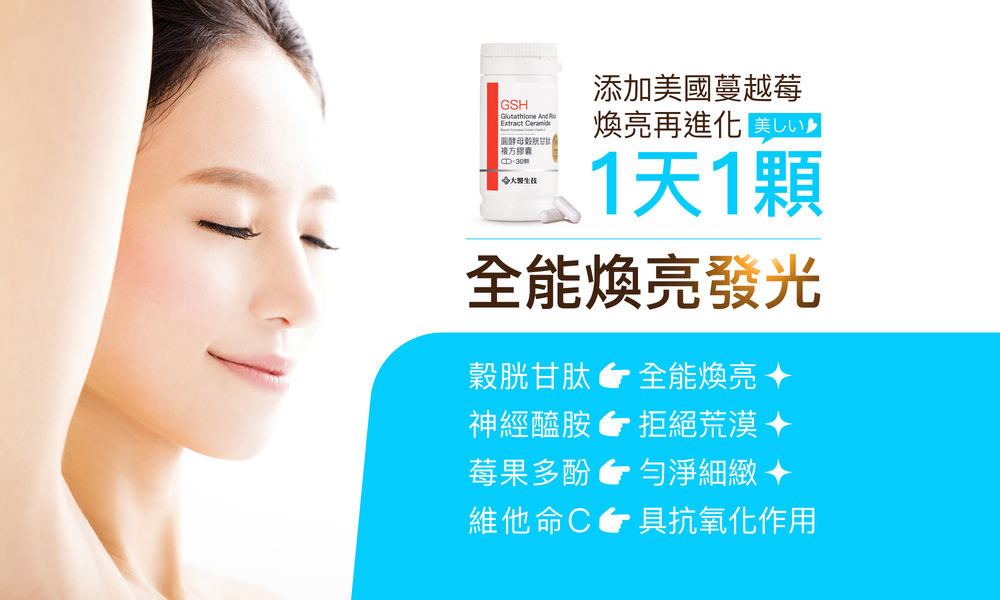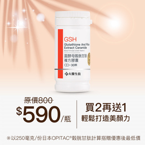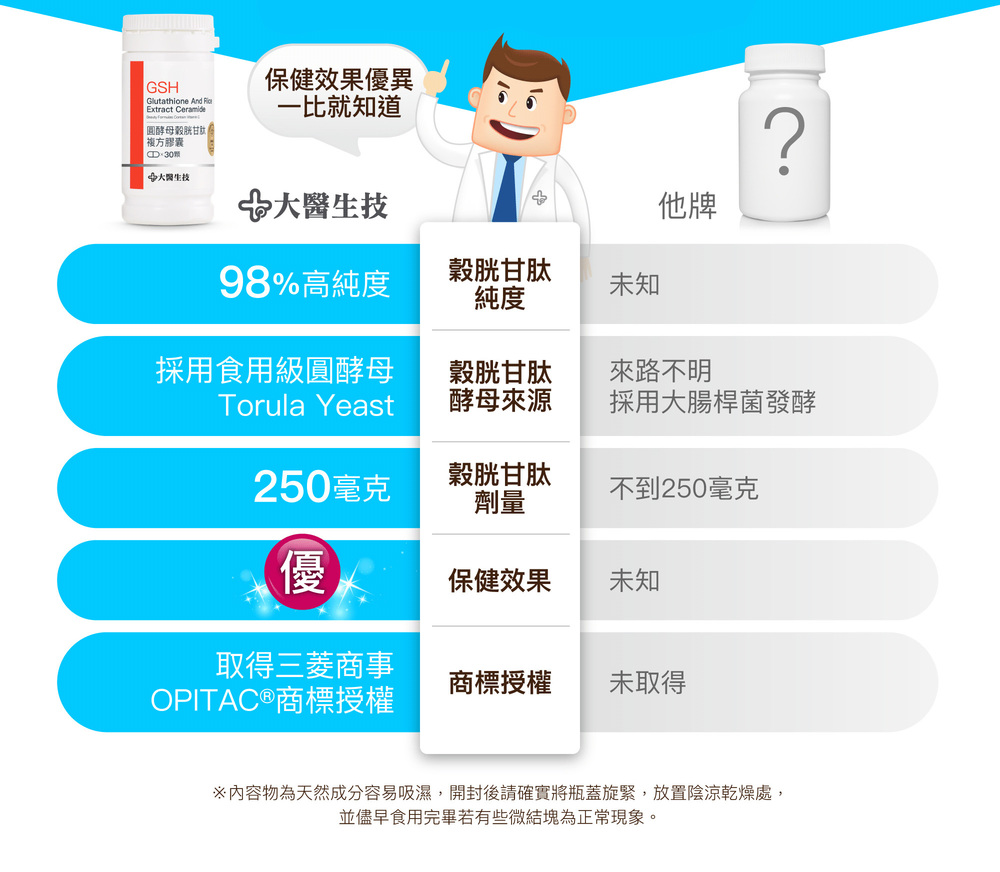 穀胱甘肽是激發美能量的關鍵!然而隨著年齡增長,穀胱甘肽也會隨之下降。大醫生技圓酵母穀胱甘肽複方膠囊,採用日本原廠授權認證的OPITAC®穀胱甘肽,經實驗證實,受試者食用後,體內濃度顯著上升!讓你的美持續閃耀、煥發動人。