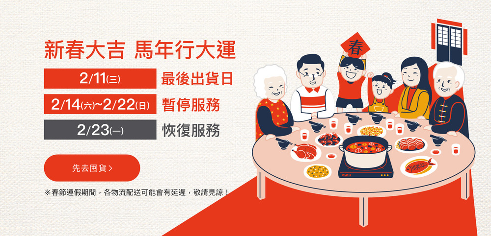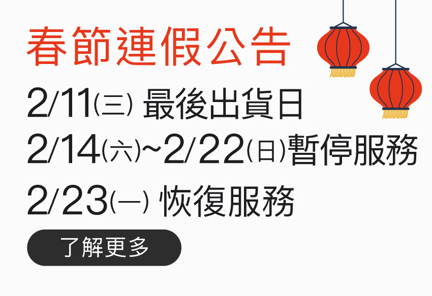 - 春節期間暫停服務:2/14(六)~2/22(日) 暫停【出貨/客服/門市】服務