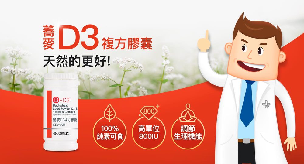 一般認為透過充足的日曬光照後,我們體內可以自然合成維他命D,而此時從光照中自然合成的維他命D,在結構式上是屬於D3型態,所以在選擇維他命D3的產品時,可以盡量選擇同一種型態作適量補充。而大醫生技的維他命D3,不但是純天然蕎麥萃取,並且是D3型態,可以更加貼近人體的需求,目前也有許多文獻研究證實:補充維他命D3的效果優於維他命D2。
