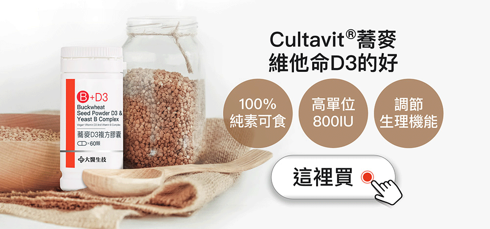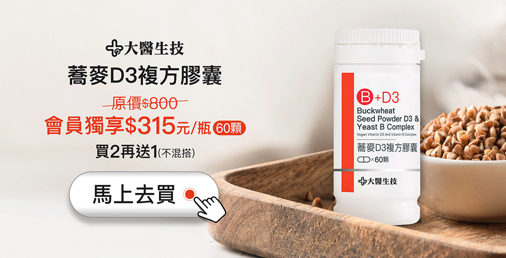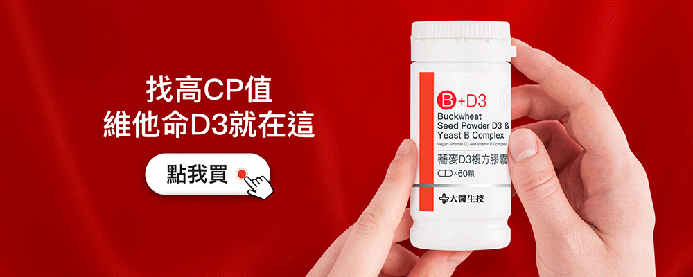 大醫蕎麥D3複方膠囊,每顆含有20微克(800IU)維他命D3,每天一顆就能輕鬆補足每日所需。若有特殊情形想要加強保養,也可詢問醫師,評估自身狀況後增量食用喔!