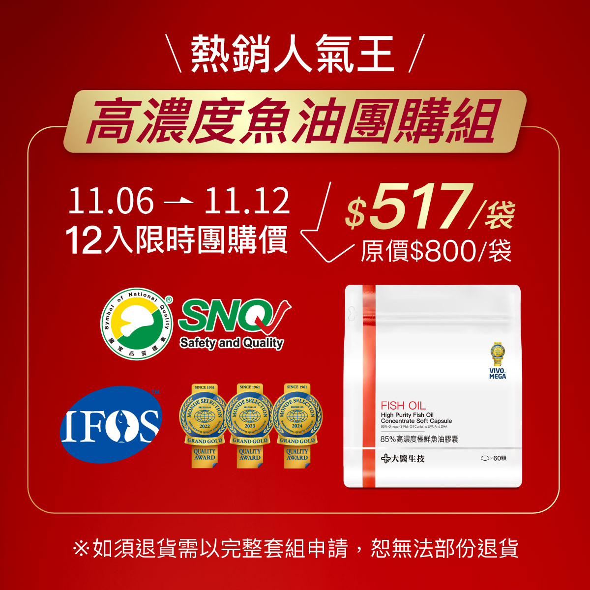 本活動套組為特惠價組,下單「1」,即出貨【85%高濃度極鮮魚油膠囊】12入。