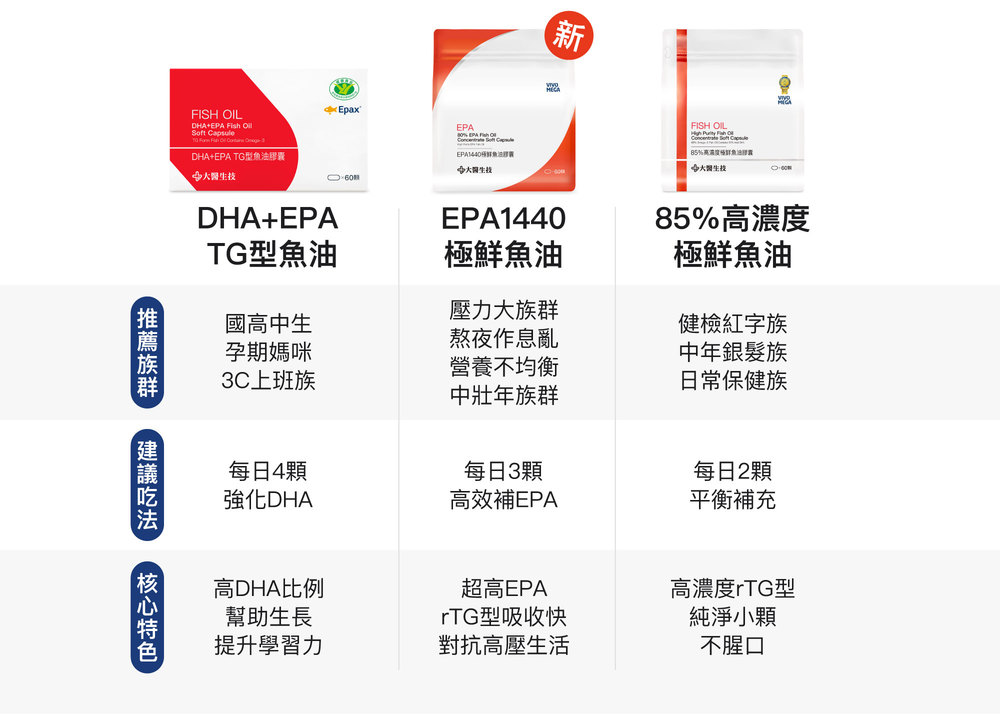 每顆含480mg EPA,3顆補足1440mg。採用rTG型態,吸收效率佳、易於利用。