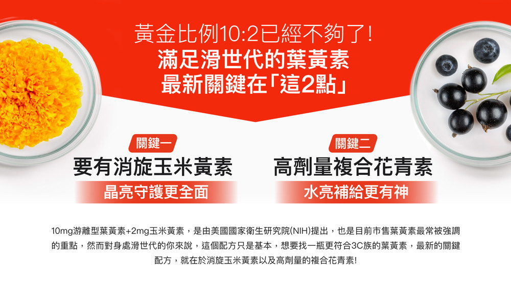 小米草萃取粉(小米草萃取物、麥芽糊精)、山桑子萃取物、複方葉黃素(辛烯基丁二酸鈉澱粉、乾燥葡萄糖漿、蔗糖、葉黃素、L-抗壞血酸鈉(抗氧化劑)、水)、黑醋栗萃取物、金盞花萃取物(金盞花萃取物(含玉米黃素)、糊精、糖、阿拉伯膠、濃縮d-α-生育醇(維生素E)、玉米澱粉)、維生素E(乙酸dl-α-生育醇酯(維生素E)、麥芽糊精、辛烯基丁二酸鈉澱粉、二氧化矽)、二氧化矽、維生素A(麥芽糊精、阿拉伯膠、玉米澱粉、維生素A醋酸鹽、dl-α-生育醇)、硬脂酸鎂