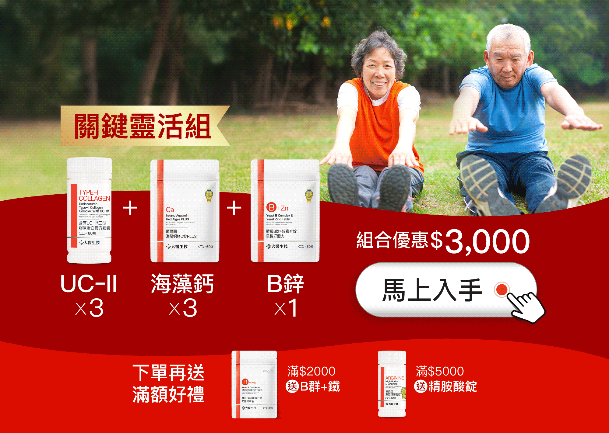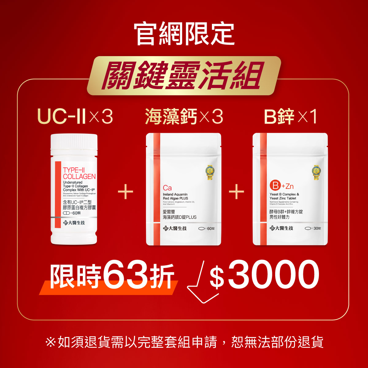 本活動套組為特惠價組,下單「1」,即出貨【UC-II®二型膠原蛋白複方膠囊】3入+【愛爾蘭海藻鈣鎂D錠PLUS 】3入+【維他命B群+鋅】1入。