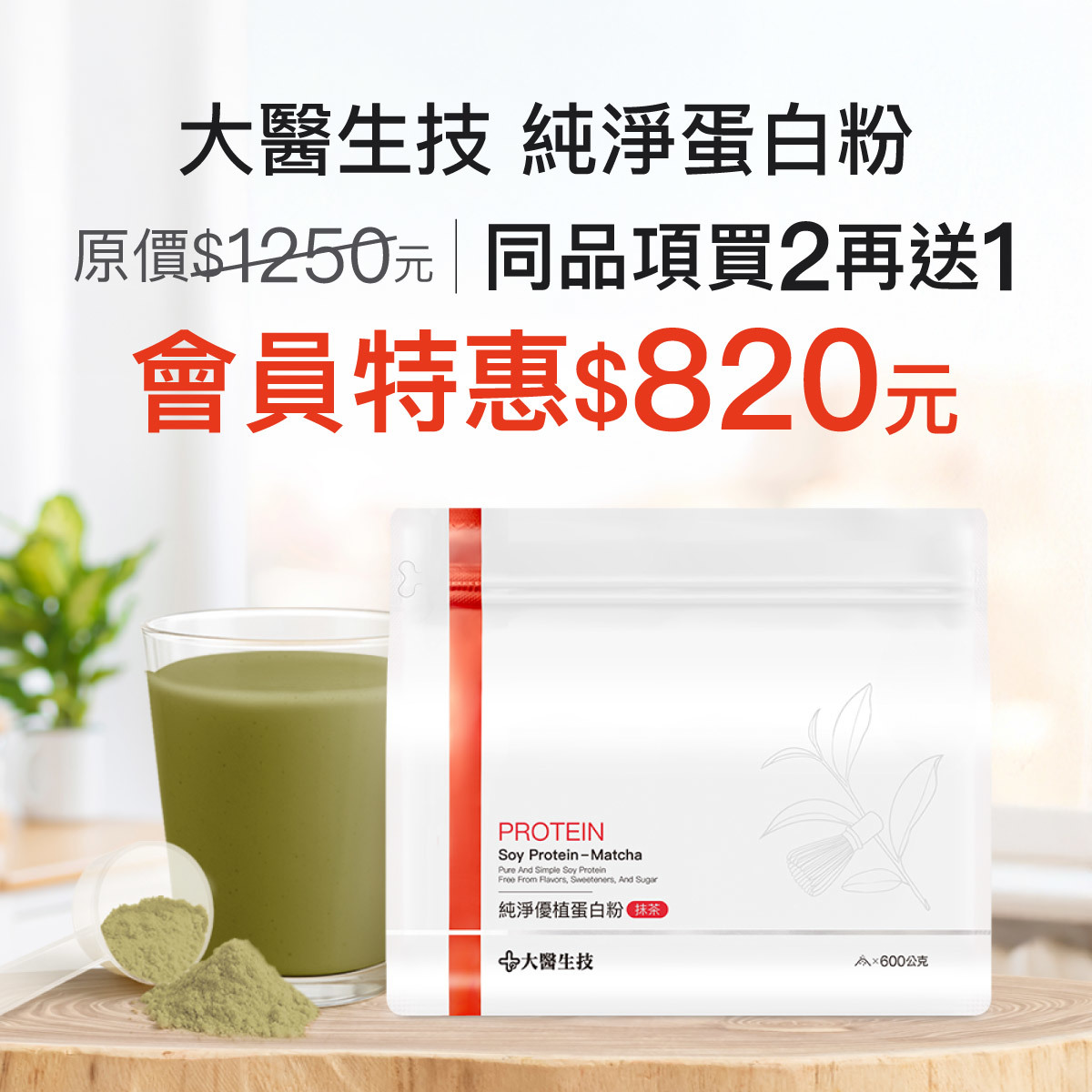依個人生理及飲食狀況,可適當補充1~5平匙大醫生技純淨蛋白粉(抹茶/可可),補足每日應攝取的蛋白質營養。但不應完全取代原型食物,以免忽略其它營養素的攝取哦!