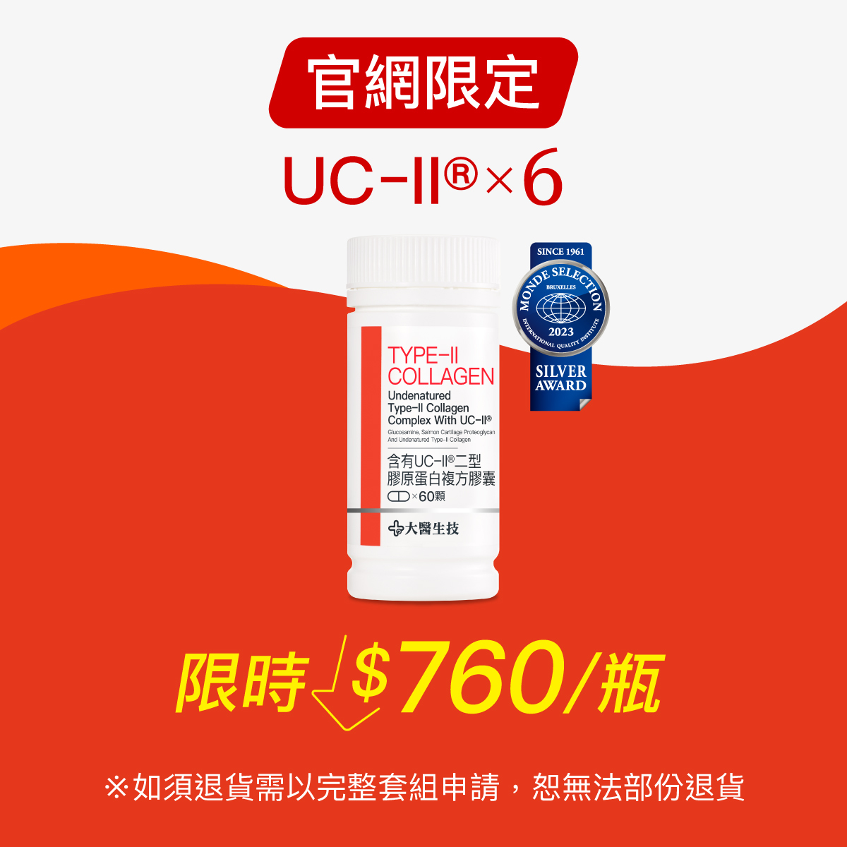 本活動套組為特惠價組,下單「1」,即出貨UC-II®二型膠原蛋白複方膠囊(60顆) x6入。