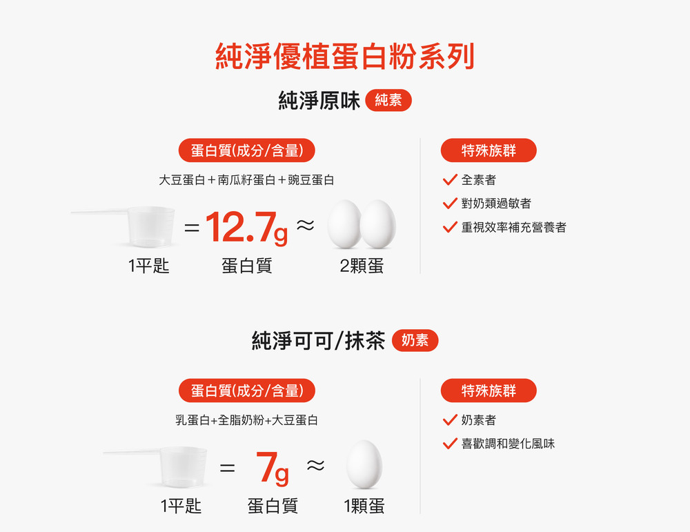 原味為「全素」,使用純植物性蛋白(大豆、南瓜籽、豌豆);可可、抹茶風味款為「奶素」,含天然奶粉。購買前可依個人飲食習慣選擇適合的品項。